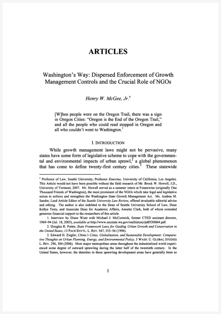 Article published in the Seattle University Law Review, comparing Oregon versus Washington State enforcement approaches to growth management and land use laws. Researched and primarily written by Brock Howell, with additional final writing and editing by Prof. Hank McGee. Brock was credited in the footnote.