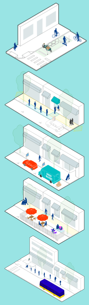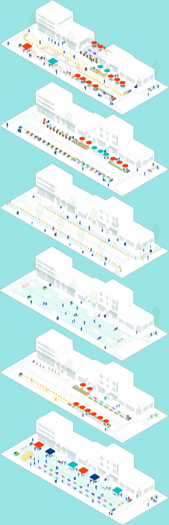 For the Healthy Business Streets Guide, Brock created individual isometric graphics to illustrate different possible layouts of streets that would provide more space for people to social distance while supporting local businesses.