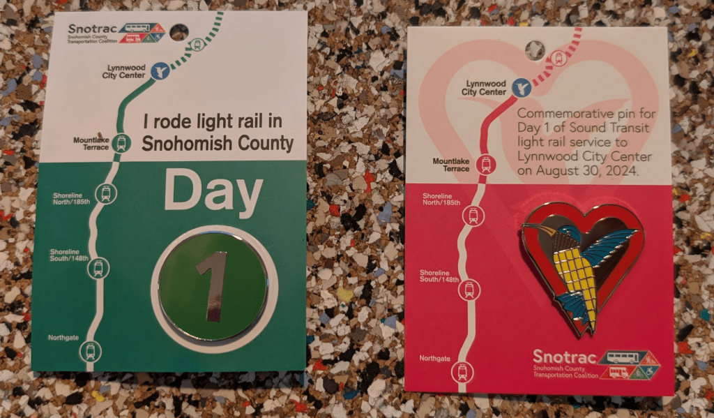 Brock designed these commemorative 1.25″ lapel pins and backing cards for the grand opening of the Lynnwood City Center Light Rail Station Grand Opening. The green lapel pin matches the icon for the 1 Line icon. The heart+hummingbird lapel pin reflect the two statues in Lynnwood City Center.