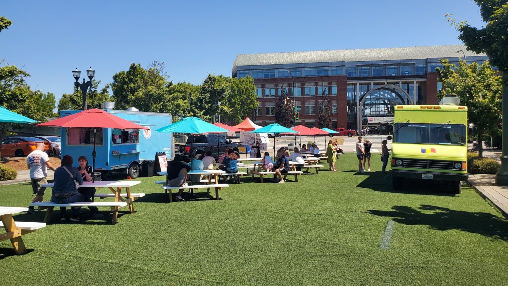 During the summer of 2023, converted one block of street in front of Everett Station into a public park with FieldTurf and picnic tables, activated on Wednesdays with a farmers market and Fridays with food trucks and live music.